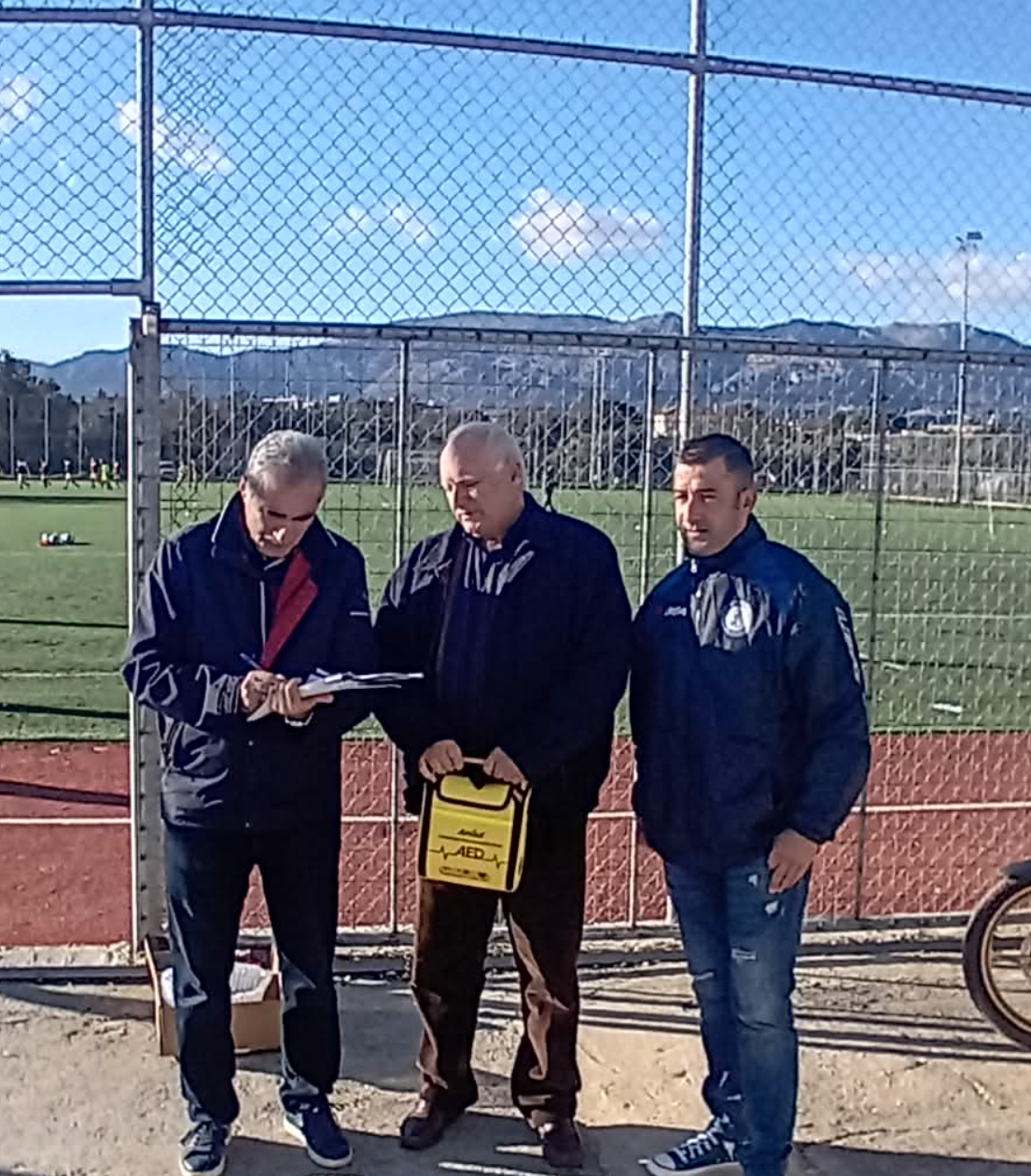 Η Περιφερειακή ενότητα Χίου παρέδωσε στην ΕΠΣ Χίου έναν ακόμα απινιδωτή στο γήπεδο Θυμιανών, πριν τον αγώνα Κυπέλλου Ατλα- Βροντάδος 1-2.