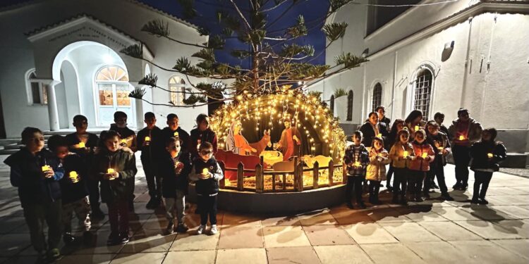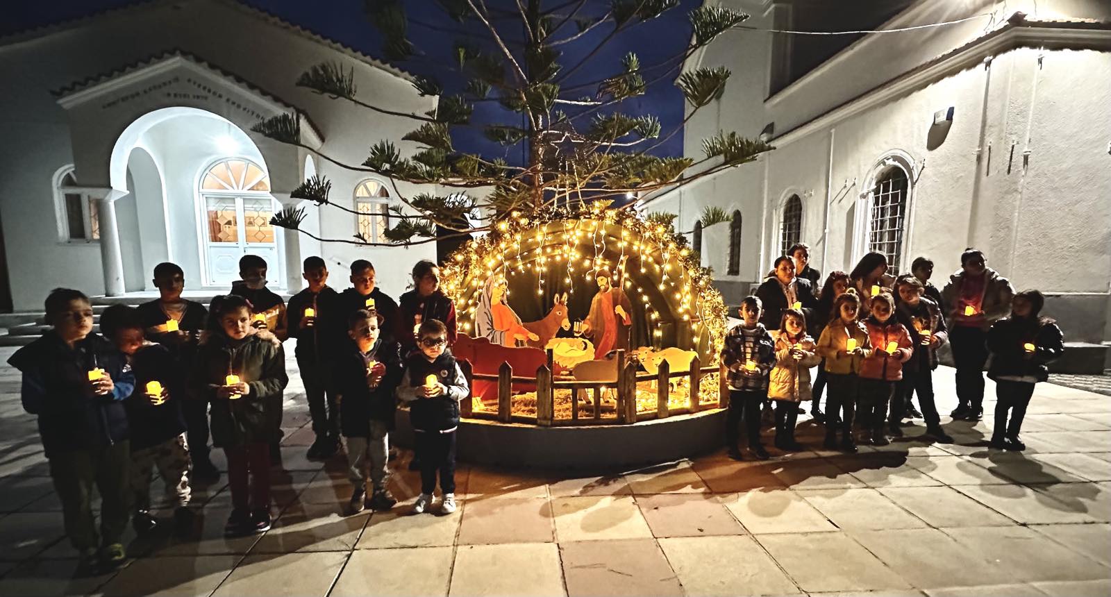 Τα παιδιά του Κατηχητικού Σχολείου του Ιερού Ναού Αγίου Μάρκου Βροντάδου, το Σάββατο 17 Δεκεμβρίου, φωταγώγησαν κάτω από τους ήχους της καμπάνας τη Φάτνη των Χριστουγέννων και έψαλαν ύμνους και χριστουγεννιάτικα τραγούδια.