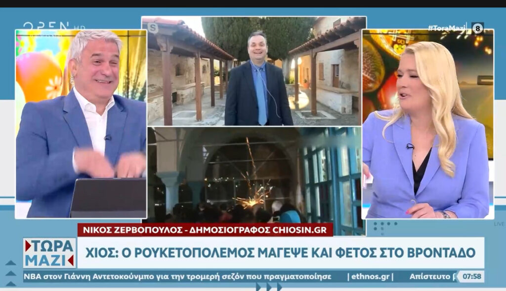 Στην εκπομπή του OPEN Τώρα Μαζί με τον Σπύρο Χαριτάτο και την Ρέα Πράπα πραγματοποιήθηκε απευθείας σύνδεση με τη Χίο την Κυριακή του Πάσχα λίγο πριν τις οκτώ το πρωί. Ο δημοσιογράφος της Chiosin.gr Νίκος Ζερβόπουλος συνδέθηκε ζωντανά από το Ιστορικό μοναστήρι της Επισκέψεως Κοινής ένα από τα 24 Μαστιχοχώρια που πραγματοποιήθηκε μόνο ο Επιτάφιος την Μεγάλη Παρασκευή και την Νέα Τρίτη που θα γίνει η μεταφορά των εικόνων.