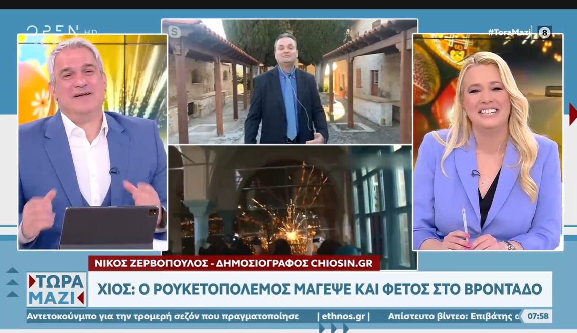 Στην εκπομπή του OPEN Τώρα Μαζί με τον Σπύρο Χαριτάτο και την Ρέα Πράπα πραγματοποιήθηκε απευθείας σύνδεση με τη Χίο την Κυριακή του Πάσχα λίγο πριν τις οκτώ το πρωί. Ο δημοσιογράφος της Chiosin.gr Νίκος Ζερβόπουλος συνδέθηκε ζωντανά από το Ιστορικό μοναστήρι της Επισκέψεως Κοινής ένα από τα 24 Μαστιχοχώρια που πραγματοποιήθηκε μόνο ο Επιτάφιος την Μεγάλη Παρασκευή και την Νέα Τρίτη που θα γίνει η μεταφορά των εικόνων.