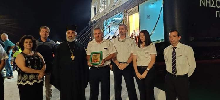 Ο Ιερός Ναός Παναγίας Λατομιτίσσης Χίου, τίμησε σήμερα τον πλοίαρχο του ΕΓ/ΟΓ ΝΗΣΟΣ ΣΑΜΟΣ καπετάν Γεώργιο Αρβανίτη για την απόδοση τιμών κάθε χρόνο στη εορτή της Παναγίας μας το δεκαπενταύγουστο. Ο π. Βασίλειος Φιλιππἀκης εφημέριος του Ναού του απέδωσε τιμητικό δίπλωμα, την εικόνα της Παναγίας και τους ευχήθηκε να έχουν καλά και γαλήνια ταξίδια.