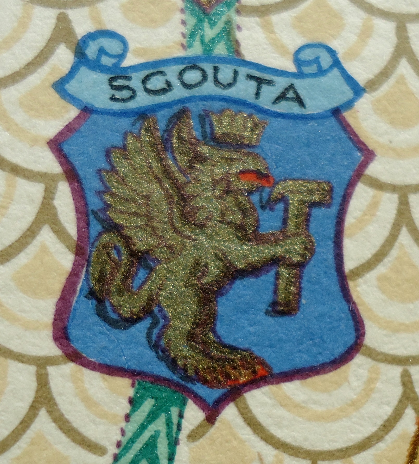 Η επιλογή του γρύπα στον θυρεό –έχει τις δυνάμεις και τις ιδιότητες του λιονταριού και του αετού και στην αρχαιότητα είχε κυρίως το ρόλο του φύλακα– καθώς και του αντικειμένου που κρατάει, και που από λόγχη καταλήγει ως ένα σφυρί στη νεότερη απεικόνισή του στο Libro d‘ oro, θα είχε για την οικογένεια Σγούτα τον ιδιαίτερο συμβολισμό της.