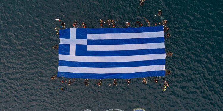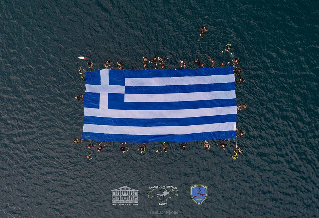 Συγκεκριμένα, ο Σύλλογος Αυτοδυτών Σάμου και δύτες της αυτόνομης κατάδυσης του Λιμεναρχείου Σάμου, υπό την οργανωτική υποστήριξη του δήμου Ανατολικής Σάμου, «βύθισαν» ελληνική σημαία, διαστάσεων 7 επί 15 μέτρων, στη θάλασσα.