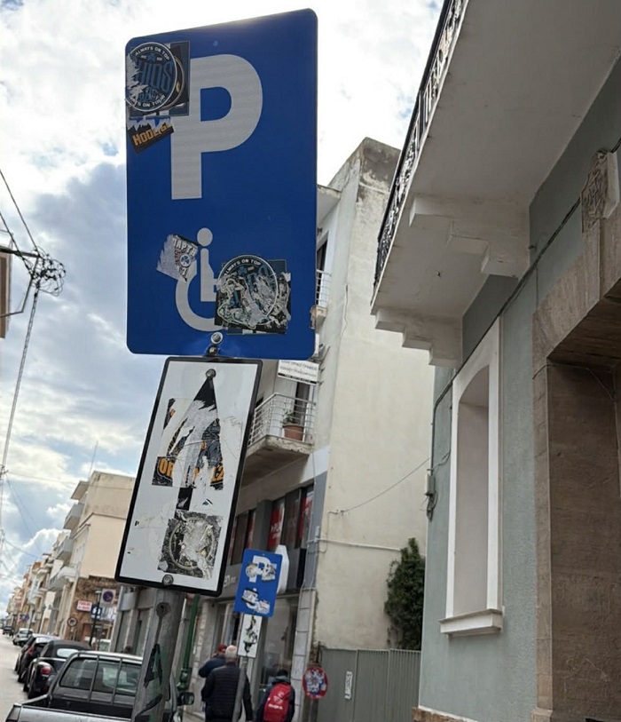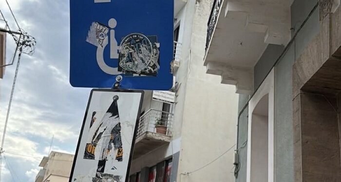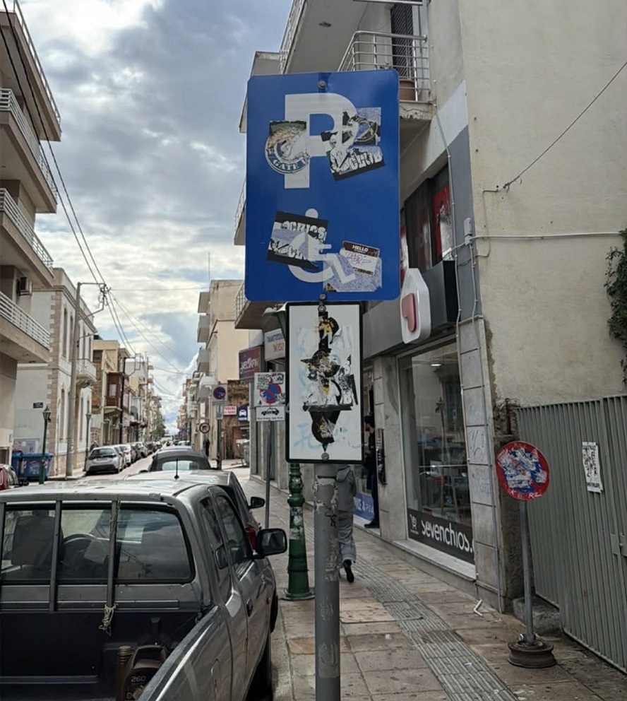 Σε έναν συνηθισμένο αστικό δρόμο και συγκεκριμένα στην Λιβανού, μια πινακίδα στάθμευσης για άτομα με αναπηρία στέκεται σχεδόν αόρατη. Όχι επειδή λείπει, αλλά επειδή έχει καλυφθεί από αυτοκόλλητα, φθορές και αδιαφορία. Το σύμβολο που κάποτε δήλωνε ξεκάθαρα έναν χώρο προσβασιμότητας, πλέον χάνεται μέσα σε ένα χάος εικόνων και μηνυμάτων.