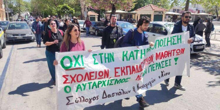 Οι εκπαιδευτικοί στη Χίο, Τρίτη 9/4/2024, διαδηλώσαμε ότι όσο το Υπουργείο θα απειλεί εμείς θα είμαστε ενωμένοι. Στην συγκέντρωση συμμετείχαν δεκάδες εκπαιδευτικοί, καθώς επίσης εκπρόσωποι άλλων σωματείων , όπως το ΝΤ ΑΔΕΔΥ, το Εργατικό Κέντρο, το Σωματείο Ιδιωτικών Υπαλλήλων, το Κέντρο Πρόληψης Χίου, που με αποφάσεις στέκονται αλληλέγγυοι στον αγώνα μας. Στην συγκέντρωση μίλησε από την πρωτοβάθμια ο δάσκαλος Πληροφορικής Νέστορας Ξυλάς, που ο ίδιος νεοδιόριστος, εδώ και τρία χρόνια είναι στον αγώνα ενάντια στην κατηγοριοποίηση σχολείων, εκπαιδευτικών, και μαθητών και συμμετέχει στην απεργία αποχή. Τόνισε ότι παρά τον αυταρχισμό της κυβέρνησης, θα υπερασπιστούμε την εργασιακή μας αξιοπρέπεια μέχρι να νικήσουμε.