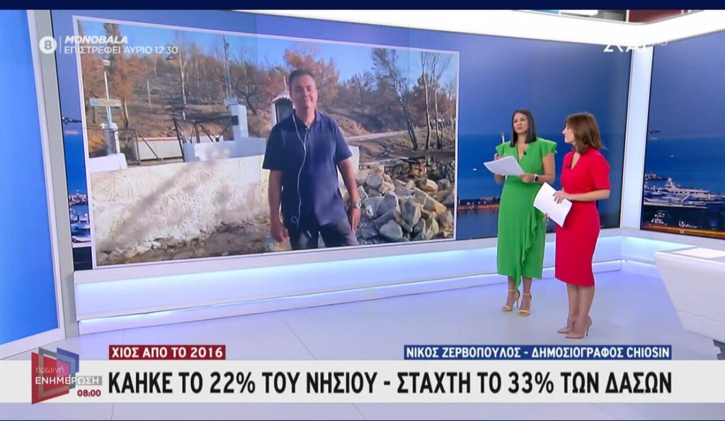 Εκεί ο δημοσιογραφος Νικος Ζερβοπουλος αναφερθηκε στις ζημιες που εχουν υποστει οι πυροπληκτοι, την διαδικασια των αποζημιωσεων, τις επιπτωσεις στα Μαστιχοχωρια και τα μαστίχια, τους ιδιωτες που προσφερουν στις πληγεισες περιοχες αλλα στην αποδοση ευθυνων στους υπαιτιους των πυρκαγιων που ακομα εκκρεμει παροτι απο την πρωτη μεγαλη φετινη φωτιά στη Χιο εχουν περασει δυο μηνες.