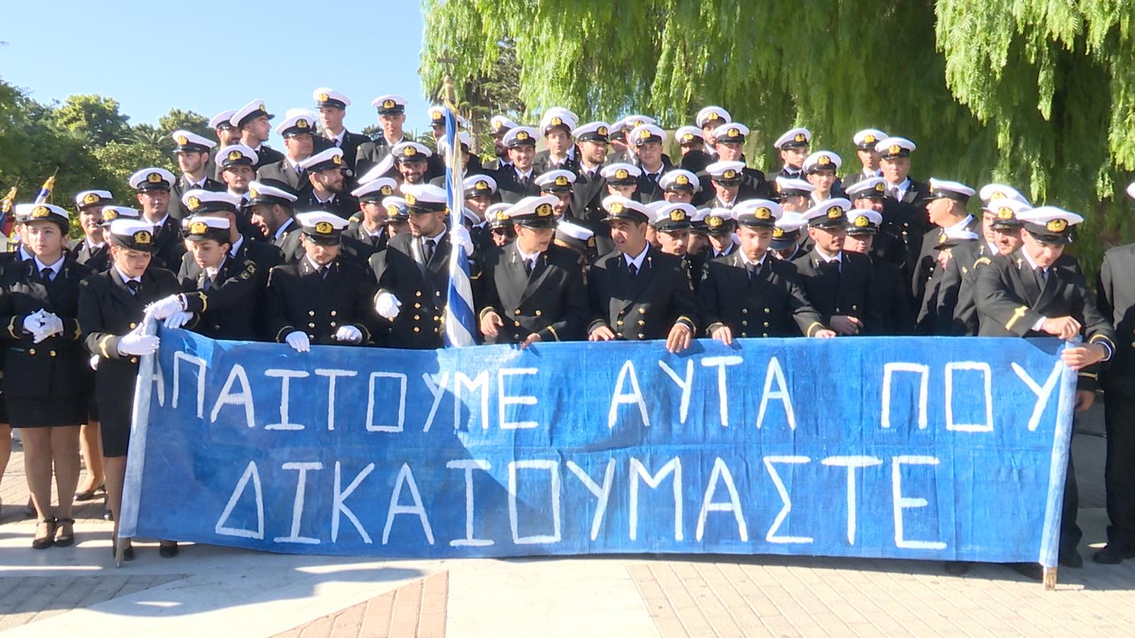 Διαμαρτυρία των σπουδαστών της ΑΕΝ Οινουσσών για την έλλειψη εκπαιδευτικού προσωπικού με πανό μετά την παρέλαση.