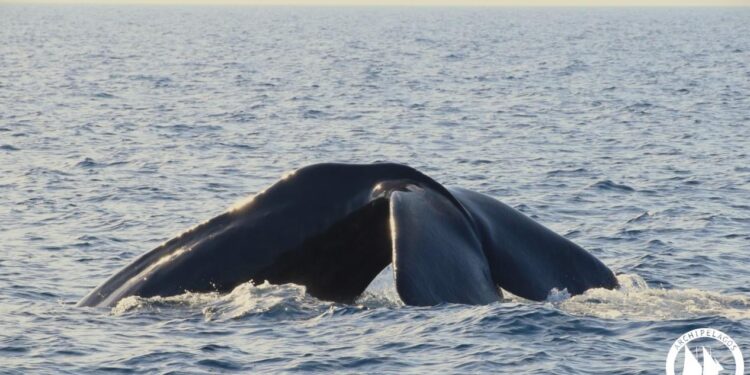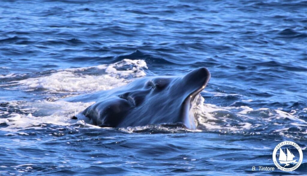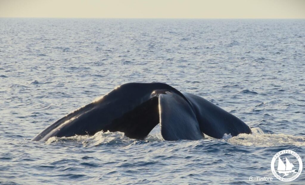 Το Σάββατο, λίγο πριν ξεκινήσουν οι έντονοι βοριάδες, καταγράψαμε έναν γνώριμο θηλυκό φυσητήρα. Ανήκει σε μία ολιγομελή κοινωνική ομάδα που απαρτίζεται από θηλυκές και νεαρά τα οποία αυτές τις μέρες βρίσκονται στην περιοχή της θαλάσσιας τάφρου. Η προηγούμενη φορά που εντοπίσαμε τον συγκεκριμένο φυσητήρα στην περιοχή ήταν τον περασμένο Σεπτέμβρη, ενώ η παρουσία της καταγράφεται από τους ερευνητές του Αρχιπελάγους εδώ και αρκετά χρόνια. Χαρακτηριστικό της γνώρισμα είναι τα βαθιά και αλλεπάλληλα τραύματα στα πλευρά από προπέλα πλοίου, όμως αυτός ο φυσητήρας ήταν τυχερός και επέζησε.