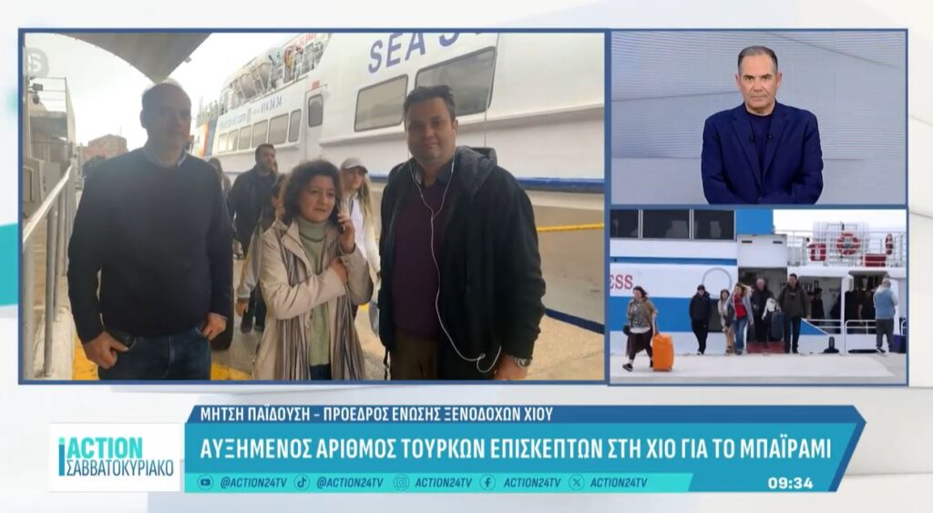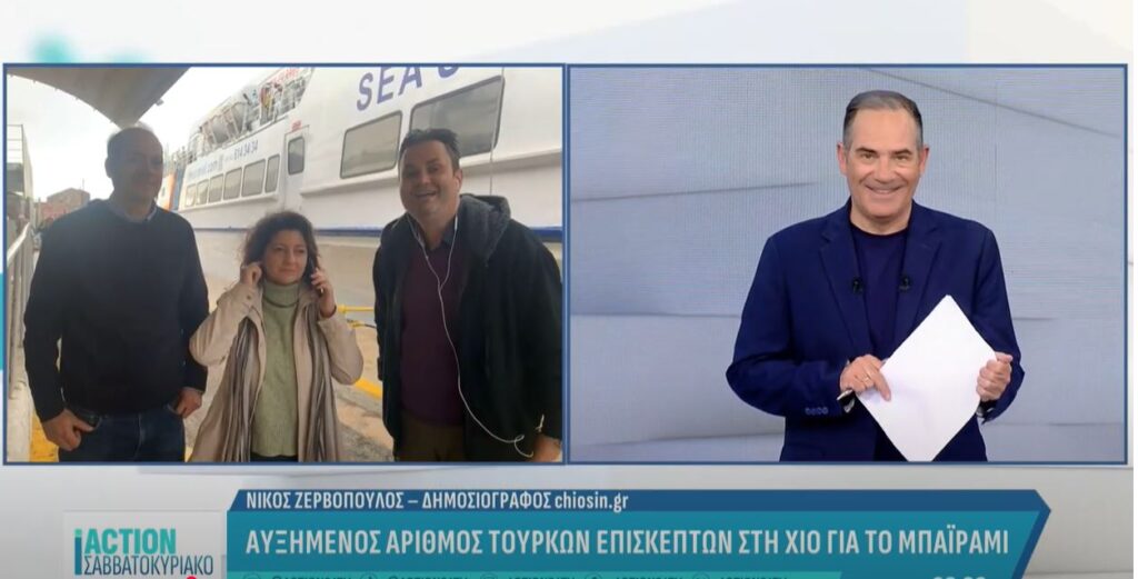 Η Τούρκικη ‘απόβαση’ στη Χίο προβλήθηκε ζωντανά σε όλη την Ελλάδα την ώρα άφιξης του πλοίου από τον Τσεσμέ. Την ώρα που έφθανε το πλοίο η εκπομπή ΑCTION 24 ΑCTION Σαββατοκύριακο με τους Δημήτρη Καμπουράκη και Βαγγέλη Γιακουμή συνδέθηκε στο τελωνείο της Χίου με τον δημοσιογράφο Νίκο Ζερβόπουλο, την Πρόεδρο της Ένωσης Ξενοδόχων Χίου Μήτση Παιδούση και τον Γιώργο Μυλωνάδη Πρόεδρο του Συλλόγου Ενοικιαζομένων Επιπλωμένων Δωματίων, Διαμερισμάτων και Τουριστικών Κατοικιών.