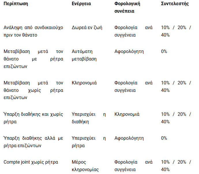 Αν δεν υπάρχει ρήτρα, τα χρήματα αποτελούν μέρος της κληρονομίας και κατανέμονται σύμφωνα με τη διαθήκη, με την αντίστοιχη φορολογία (10%, 20% ή 40%).