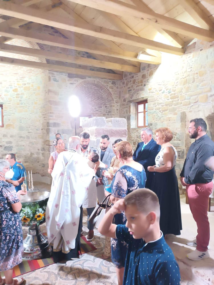 Μετα τα εγκαίνια του Ναού ειναι η πρωτη βαπτιση που γινεται. Το μυστήριο τέλεσε ο ιερέας Ιωαννης Τσιμουνης μαζι με τον ιερέα Γεωργιο Γιαννιωδη,που την ιδία μέρα το πρωί, χειροτονήθηκε ιερέας απο τον Σεβασμιότατο Μητροπολίτη μας κ.Μάρκο,ητανε το πρωτο του Μυστήριο της βαπτισης που εκανε.Οι γονείς του Νεοφώτιστου Γιώργος και Αννα Συριωδη ,οι Νονοί του Γιαννης και Αννα Μπακαροζου του εδωσαν το ονομα Ιωαννης – Θεοδόσιος.