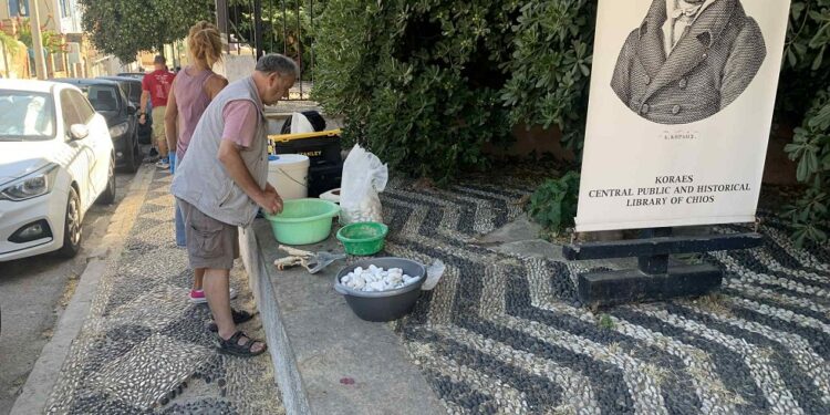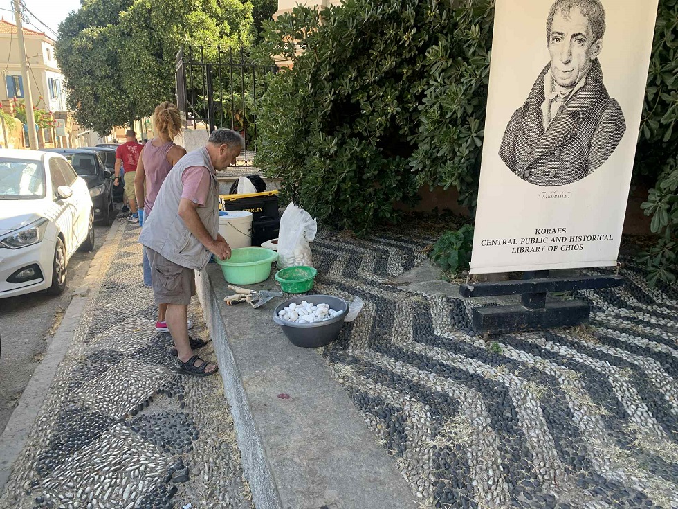 Συνεργείο του Υπουργείου Πολιτισμού ήρθε στη Χίο και αντικαθιστά το φθαρμένο βοτσαλωτό στον αύλειο χώρο της Βιβλ. Κοραή. Ο συντηρητής κ. Νίκος Τόλης μίλησε στην Chiosin.gr για τις επισκευές που θα διαρκέσουν 3 ημέρες: Είναι εμφανές ότι έχει απώλειες και είναι επικίνδυνο, θα προστεθούν νέα βότσαλα όπου χρειάζεται.