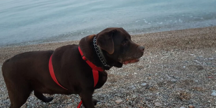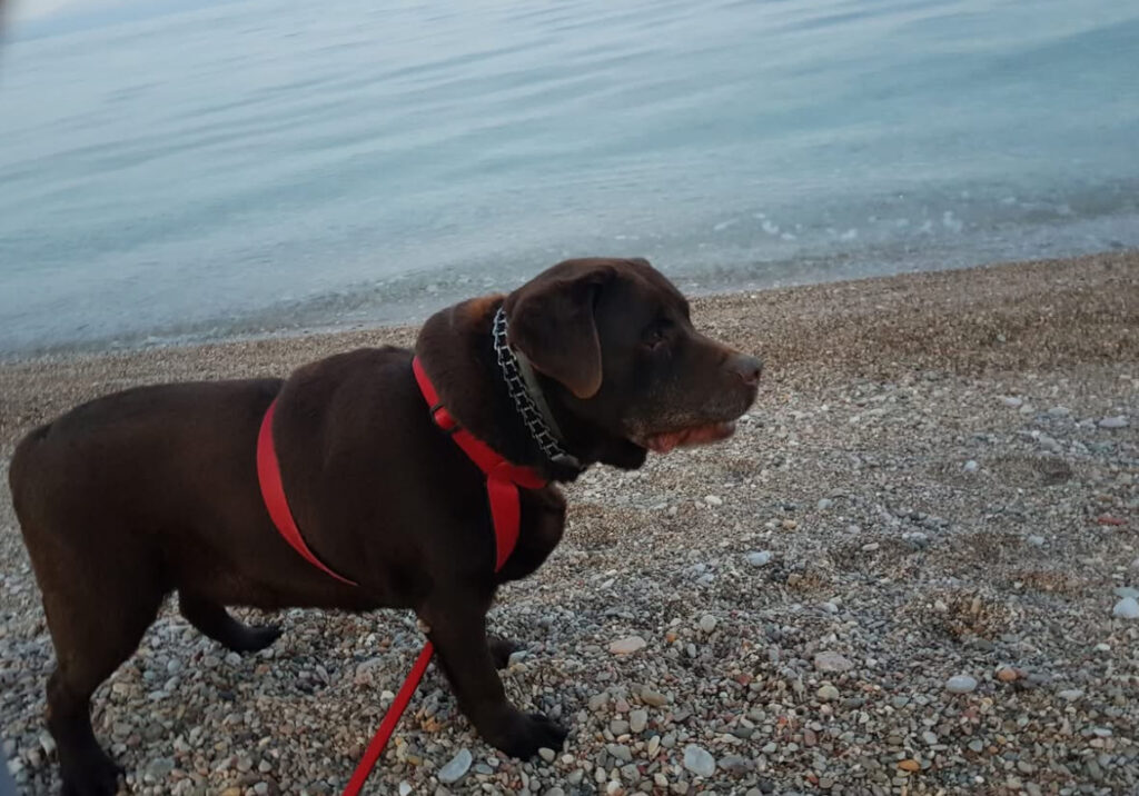 Αρσενικό σοκολατί Λαμπραντόρ 13 ετών , φοράει μεταλλικό περιλαίμιο.