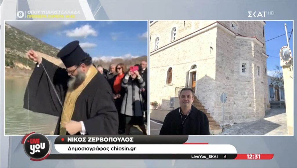 Ανταπόκριση από τη Χίο ανήμερα των Θεοφανείων στην εκπομπή του ΣΚΑΙ με τον Αρη Πορτοσαλτε και την Μαρία Αναστασοπούλου.