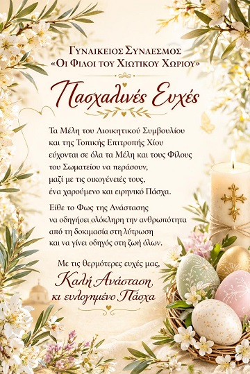 Ο γυναικείος σύνδεσμος ‘Οι φίλοι του Χιώτικου χωριού’ σας στέλνουν τις πιο θερμές ευχές για Καλό Πάσχα!