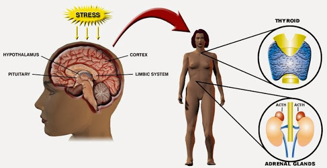 Το στρες (distress) επάγει έναν καταρράκτη αντιδράσεων στο σώμα που ξεκινά από τον υποθάλαμο και το συμπαθητικό νευρικό σύστημα και καταλήγει στα επινεφρίδια με την απελευθέρωση κορτιζόλης και κατεχολαμινών (επινεφρίνης και νορεπινεφρίνης). Η προκαλούμενη ανισορροπία επιφέρει άμεσες ή έμμεσες επιπτώσεις στην ανθρώπινη υγεία, όπως δυσλειτουργία του καρδιαγγειακού συστήματος, καταστολή της ανοσολογικής απάντησης και τροποποίηση συμπεριφορών υγείας. Η διατροφική συμπεριφορά, ένας από τους σημαντικότερους παράγοντες που καθορίζουν την υγεία, επηρεάζεται σημαντικά από το στρες.